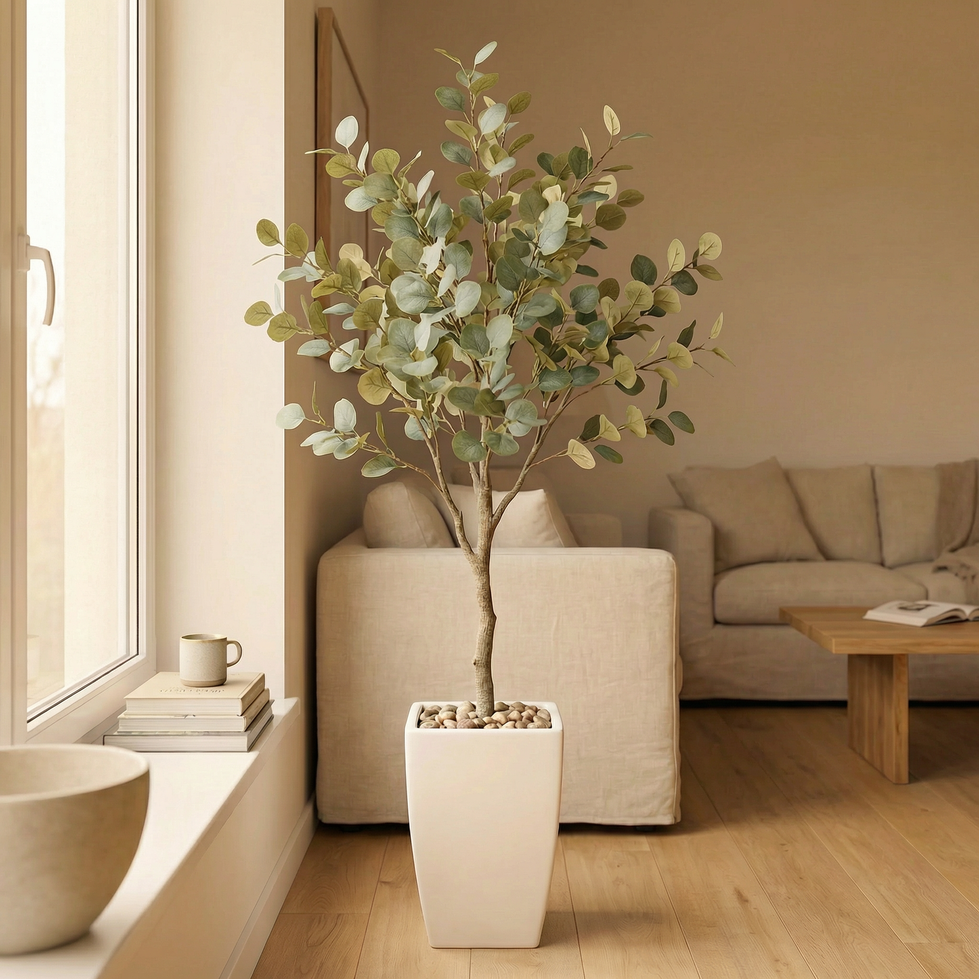 Der künstliche Eukalyptusbaum wird inklusive eines hohen dekorativen weißen Topfs mit Steinen geliefert und ist sofort platzierbar; ein zusätzlicher Übertopf ist nicht erforderlich.