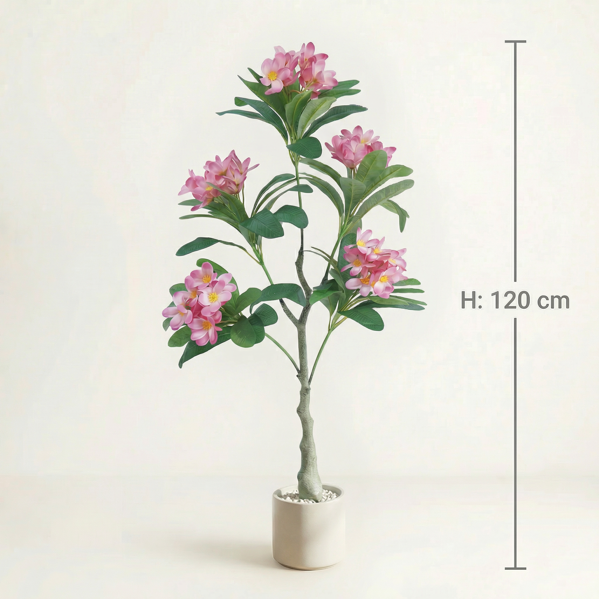 Dieser künstliche Plumeria-Baum mit zarten rosa Blüten und einer harmonischen Wuchsform bringt eine warme, tropische Ausstrahlung in Wohnräume, Büros oder Wintergärten und bleibt dabei dauerhaft pflegefrei. Die Maße betragen: Höhe der Pflanze 120 cm, Topfmaße Höhe 20,0 cm und Ø 20,0 cm.