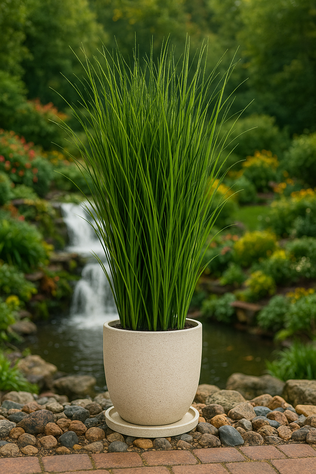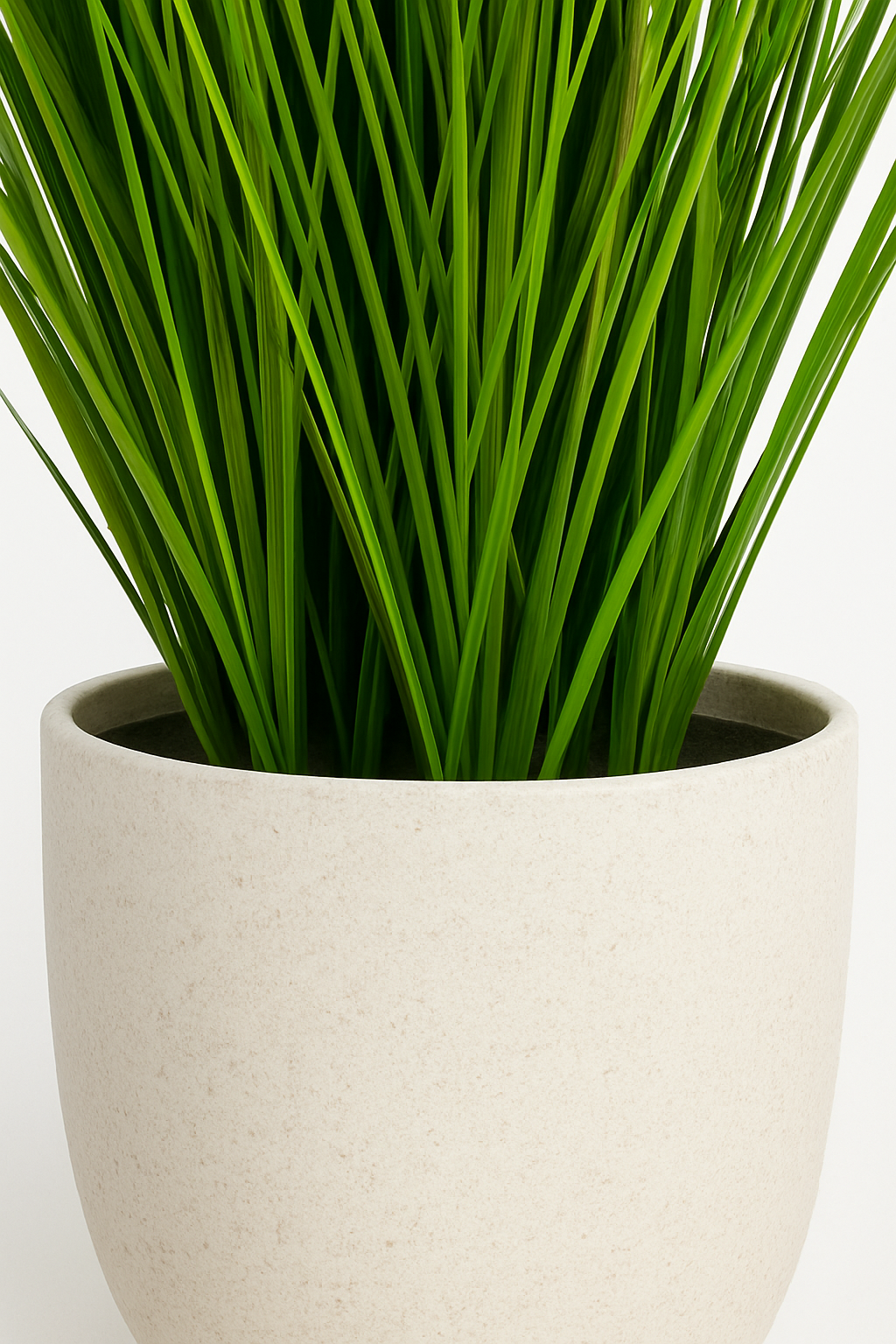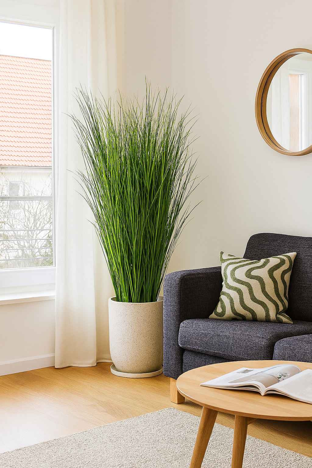 Möchten Sie Ruhe und Klarheit in Ihr Zuhause bringen? Dieses hohe künstliche Schilfgras ist die perfekte Wahl. Mit seinen schlanken, aufrechten Halmen und üppigen Grüntönen erinnert es an die ruhige Schönheit östlicher Landschaften – ganz ohne Bewässerung, Trimmen oder Sonnenlicht.